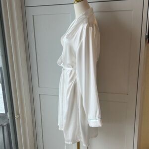 Chic white robe with elegant blue 'Bride' embroidery. Soft and comfortable for special moments. Preowned condition is excellent. There are no holes or stains. It is a 2X. Smoke-free home. Thank you for looking.