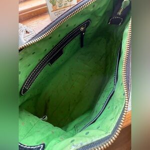 Green with black polka dot interior. 2 slip pockets and a zipper pocket. Outside snap closure pocket.