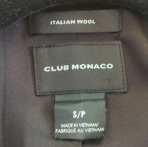Elegant and timeless, this Club Monaco Franci wool pea coat features a classic double-breasted design in a rich tan color, accented with contrast black leather trim for a sophisticated finish. A decorative buckle at the collar adds a chic, elevated detail, making this coat perfect for stylish outings and cool-weather layering.
