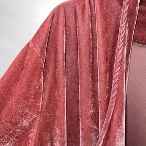 Elevate your style with this luxurious velvet open front cardigan sweater. Perfect for layering, this pink sweater adds a touch of elegance to any outfit.