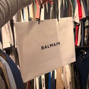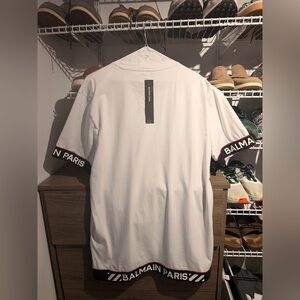 Stylish white tee featuring Balmain branding. Black logo patch on chest. Red and black trim on sleeves.