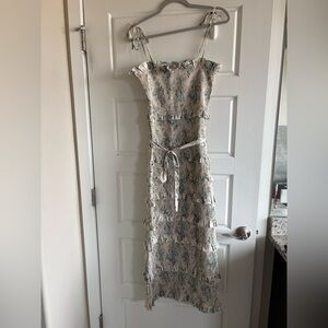 Chic midi dress with delicate floral print. Features tiered ruffles and adjustable straps. Ideal for elegant occasions. Worn once. No signs of wear. Discontinued pattern.