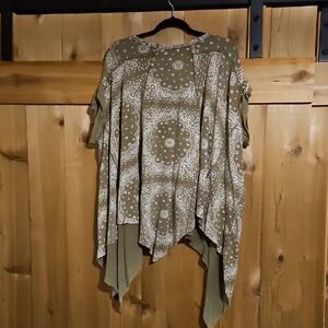 Chic olive tunic with boho print. Flowy and comfortable design. oversized will fit up to a 1X