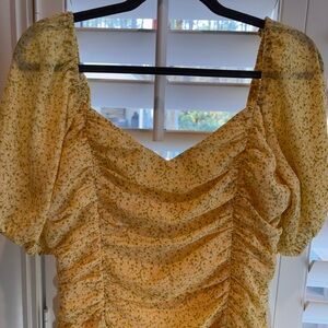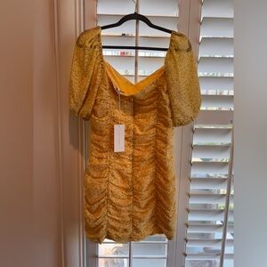 NWT Lush yellow ruched mini dress with floral pattern. Features puff sleeves and ruched design. Ideal for sunny days. Size Large