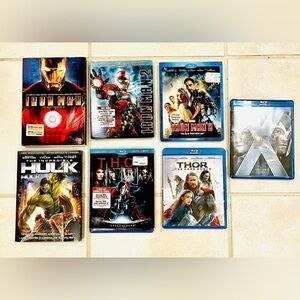All in excellent working condition. Each DVD has only been watched 2-3 times. All except Iron Man 1 and the Incredible Hulk are blu-ray editions with special features (Hulk DVD is not blu ray but contains bonus content/special features). All sleeves/jackets/cases are in great condition as well, and Iron Man 2 is still sealed/has never been opened. Great bundle gift for any Marvel fan or collector!