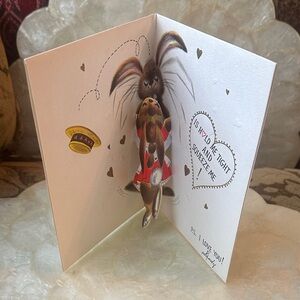 Great 3D fold out inside, funny bunnies, very cute, paper has a vintage patina. Was signed a long line ago but that could be easily covered.