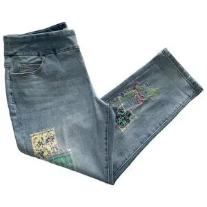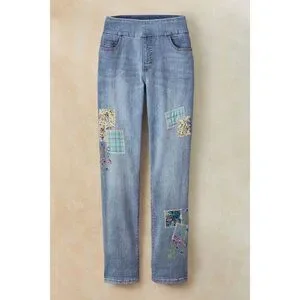 These comfortable stretch denim jeans bring patchwork flair you'll love with whimsical embroidery and appliquéd patches adding special character. The pull-on waist eliminates gapping and ensures comfortable all-day wear, while the fitted-through-hips-and-thighs silhouette flatters without feeling restrictive. High rise sits at the waist for coverage, and the straight leg with 14" opening works with everything from sneakers to boots. Classic 5-pocket styling adds authentic denim details.