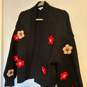 Embrace elegance with this black cardigan featuring charming floral embellishments. Perfect for adding a touch of style to your wardrobe.