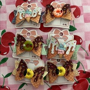 Add a sweet touch to your child's outfit with these colorful ice cream and donut hair clips. Perfect for playful styling.