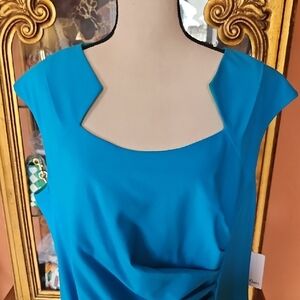 Teal blue dress, squared neck, sleeveless, ruched side,back zipper, back kick pleat. NWT 24" inches across the bust and 44" inches from shoulder to hem.