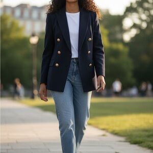 Elegant midnight blue jacket with striking gold buttons. Ideal for sophisticated events.