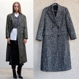 MANGO Black Marbled Textured Full Length Coat Double Breasted Wool Trench Coat S