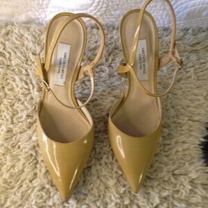Saks Fifth Ave Leather Slingback 8 Classy Quiet Lux Leather Italian Ankle strap, Quality Shoes, 4 1/2" Heels, Closed toe. Golden yellow, Very Gently Pre-Loved condition, No noticeable wear and tear - Souls are clean.