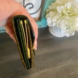 Minor peel inside back outer pocket. Clean interior with very minor leather wear. Gold toned hardware including kiss lock and zipper pull.