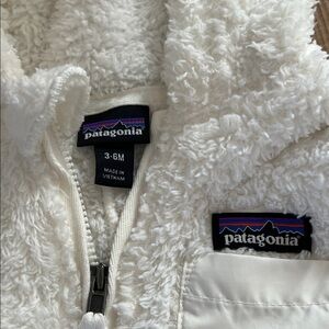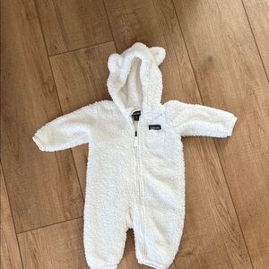 Soft white fleece onsie with cute bear ears. Features a zip front and small chest pocket. Ideal for warmth and comfort.