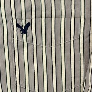 Stylish gray striped button up shirt by American Eagle Outfitters. Perfect for casual wear or for dress wear. Comfortable fit. Long Sleeves. Good used condition. Size XL see pictures for measurements.