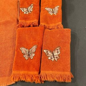 Vibrant orange towel set featuring elegant butterfly embroidery. Perfect for adding a touch of nature to your bathroom decor.