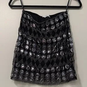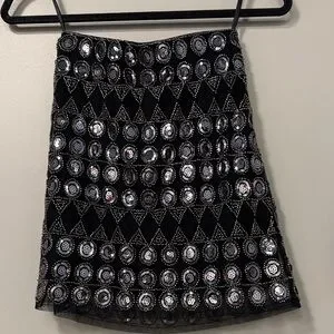 This stunning 12th Tribe black skirt features intricate silver embellishments, perfect for adding a touch of glamour to any outfit. Ideal for evening wear or special occasions. Never worn. Will provide discount if purchased with matching top.
