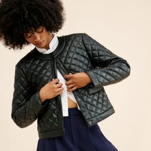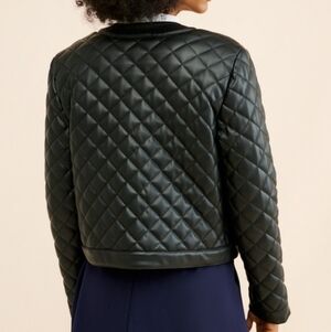 Cropped length faux leather jacket with front snap closure. Quilted vegan leather