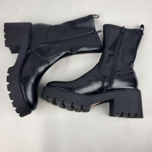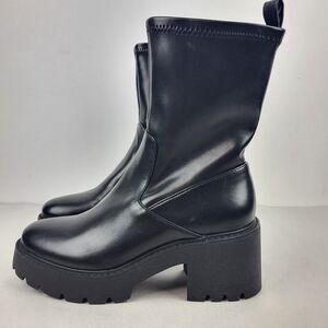 Sleek black ankle boots. Chunky heel. Side zipper closure. Perfect for versatile styling.