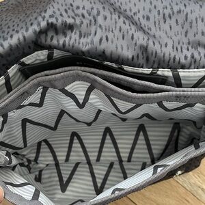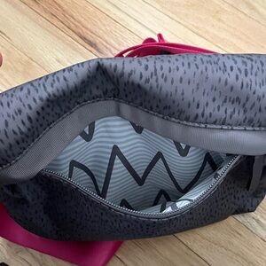 Original lululemon crossbody with a charcoal body and pink detachable strap. Strap can be converted to wear around waist. 2015 Lululemon. Two large sections in body plus phone pocket and two mesh interior patch pockets. Zipper opens very large section from the flap, which shows some discoloration in the interior (see photo). Back zipper pocket. Slight signs of wear.
