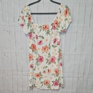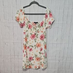 Soft and feminine floral mini dress in a pink and green print on a light background. Features a flattering square neckline with a front tie detail and short puff sleeves for a romantic touch. The fitted waist creates a flattering silhouette while the lightweight fabric keeps it comfy and easy to wear.