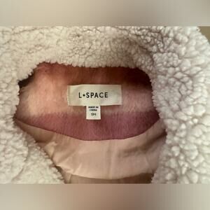 This chic and warm L*SPACE pea coat, with pink and brown ombre stripes, features a cozy sherpa collar and large front button details. Ideal for cool weather.