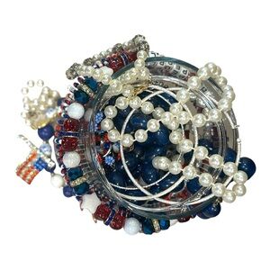 Mystery collection of red, white, and blue beaded jewelry. Includes bracelets and necklaces. Additional crafting pieces odds and ends Perfect for crafting or wearing.