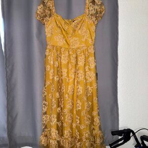 Notable Elegance, Lulus dress, yellow dress, midi dress, bustier dress, floral applique dress, mesh dress, NWT dress, new with tags, women’s size large, size L, spring dress, summer dress, party dress, wedding guest dress, cocktail dress, special occasion dress, elegant dress, feminine dress, structured dress
