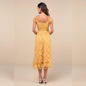 ✨ NWT Notable Elegance Yellow Mesh Floral Applique Bustier Midi Dress | Lulus Size L ✨