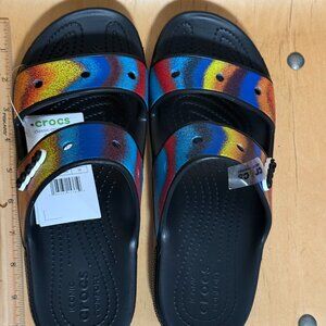 New with tags. CROCS black classic sandals with rainbow spray dye straps. Smoke free. See with ruler. Sizes shown. US Mens 8 / Women's 10. New with tags. They have the CROCS logo Jibbitz attached. Fast and secure shipping. Casual, yoga, gym, slides, slip on, sandals, beach, vacation, cruise, unisex, footwear, shoes, workout.