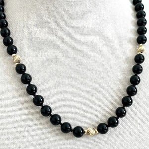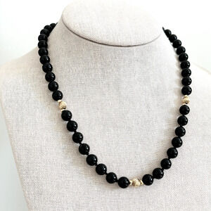Vintage 14K Yellow Gold Bead Ball & Black Onyx Hand Knotted Beaded Necklace 18"
