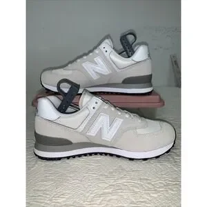 The product is a pair of women's New Balance classic 574 sneakers in size 10, featuring a stylish cream color and a comfort B shoe width. With a UK shoe size of 8, US shoe size of 10, and EU shoe size of 41.5, these athletic shoes are perfect for activities like gym training, walking, boxing, and running. The classic 574 model by New Balance offers a blend of style and performance, making them a versatile choice for everyday wear.