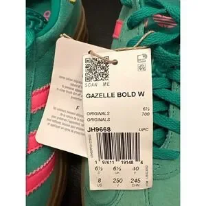 Step into vibrant style with these eye-catching Adidas Gazelle Bold W platform sneakers. Experience the playful fusion of a classic silhouette with a modern, chunky sole that elevates your look and your comfort. The lush green suede is beautifully accented by bold pink stripes and a cheerful yellow heel, creating a color combination that pops with personality. The platform design offers a fashionable lift, perfect for adding an edge to your everyday outfits or making a statement at casual gatherings. Pair them with jeans for a cool street style vibe or a sundress for a fun, retro-inspired ensemble.