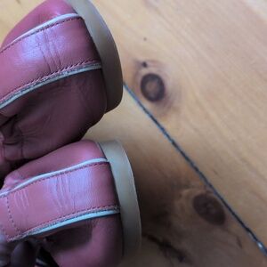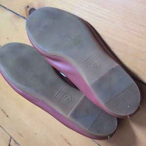 leather, dark rose color, size 8.5. they are in good condition but see pictures for wear, especially one scratch on right toe and tiny marks at right foot opening. elastic back. super cute and gorgeous dusky pink color, but in my opinion they maybe run a little small (on me they are just a bit snugger than I wanted - would likely stretch and mold to your foot with wear though?)