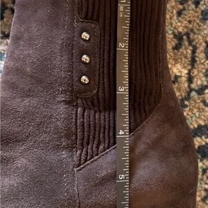 Chic dark brown ankle boots with sleek design. Features subtle stud accents. Ideal for versatile styling.