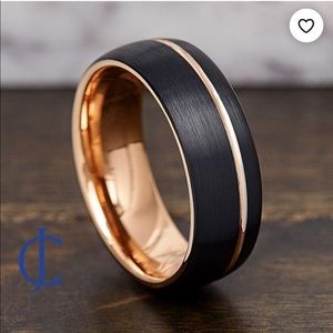 It is a Rose Gold and Black plated tungsten ring with a domed brushed top.