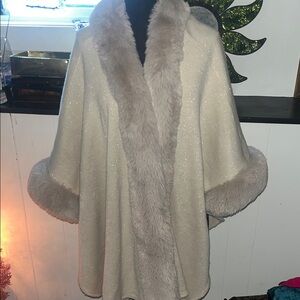 Stylish beige cape with luxurious fur trim. Perfect for elegant layering.