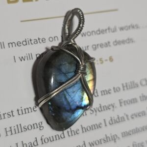 Elegant wire wrapped iridescent stone pendant. Perfect for any occasion.