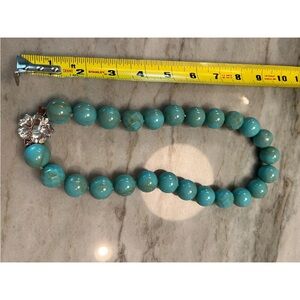 This stunning turquoise beaded necklace features a beautiful floral clasp, adding a touch of elegance to any outfit. Perfect for any occasion.