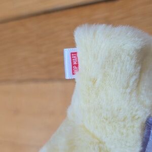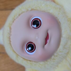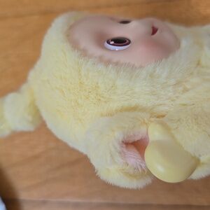 This is a POP MART Teletubbies Vibrancy Series figure featuring Butter Laa-Laa. This collectible has a weighty, solid plastic construction covered in a soft, fuzzy yellow material. It features the signature holographic television screen on the tummy and comes w/ the original character card and box.