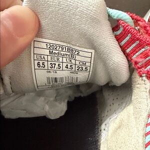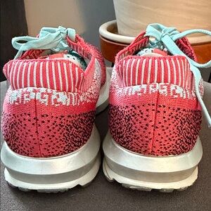 Eye-catching red and aqua design. Ideal for running. Lightweight and supportive.