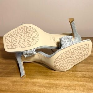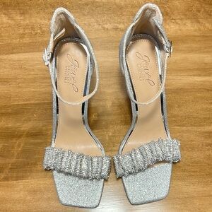 Jewel by Badgley Mischka silver glitter heeled open toe sandals shoes with beautiful ruched rhinestone over the toe panel - heel height is 4” - brand new - no box - no tags - All manmade materials - These are a bright beaming Christmas silver despite looking slightly dark in the photos - Beautiful formal occasion shoes - Standard width