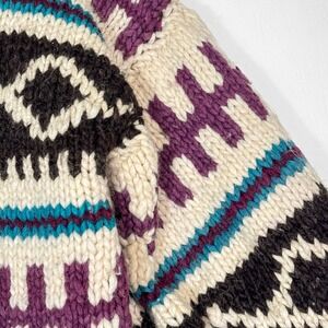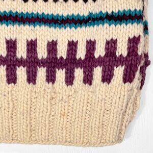 Vintage heavy hand knit chunky knit fair isle fisherman sweater featuring a colorful geometric pattern. This crew neck mock neck sweater showcases a geometric design with bands of cream, deep purple, black, and teal. No brand or material tag.