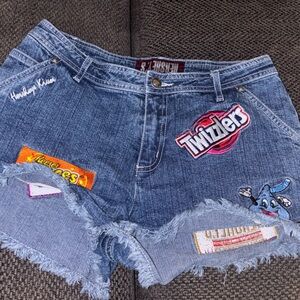 Stylish blue denim shorts featuring fun patches. Perfect for casual outings.