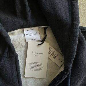 Cozy black zip-up hoodie. Features front pockets and drawstring hood. Perfect for casual wear.