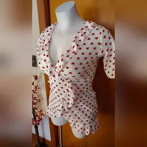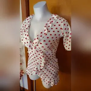 Adorable PrettyLittleThing dress in new with tags (NWT), featuring a flirty white base with mini red hearts all over. This dress has a wrap-style appearance with a ruffle along the deep V-neck and faux wrap line—so you get the chic wrap look without the actual wrap. Short sleeves make it perfect for spring and summer occasions!