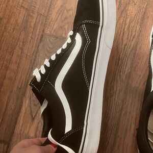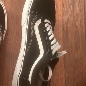 Classic Vans sneakers with a black and white design. Comfortable and stylish for everyday wear.