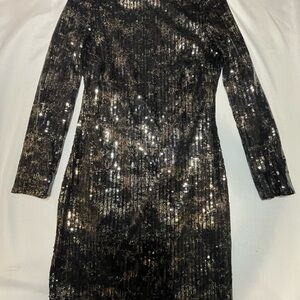 Elegant long sleeve dress with shimmering sequins. Perfect for evening events paired with a strappy heal. Perfect for a formal event.