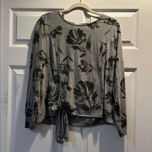 Gently worn Anthropologie T.la Gray Black Floral Tie Front Long Sleeve Tee Top women's size medium. Rayon/cotton/poly knit blend, gray with black floral print. Scoop neckline, long sleeves, slightly oversized fit, tie detail at front waist. Offers accepted!
